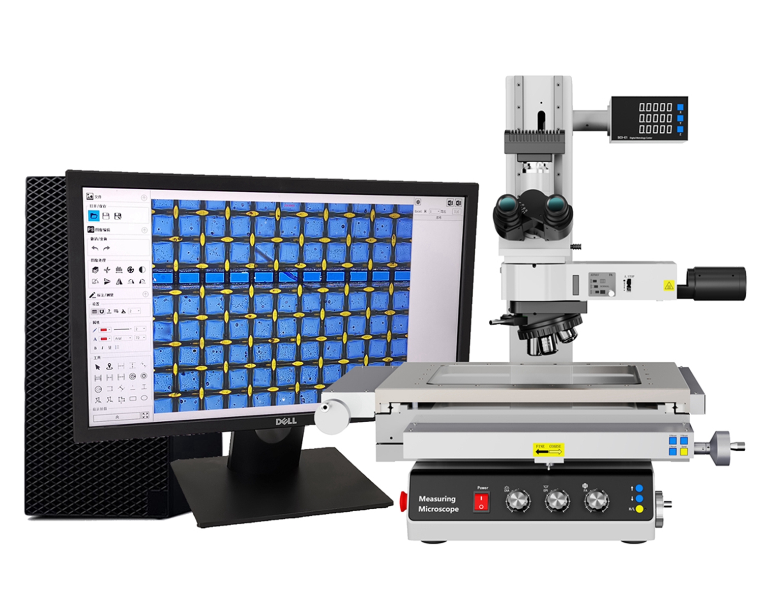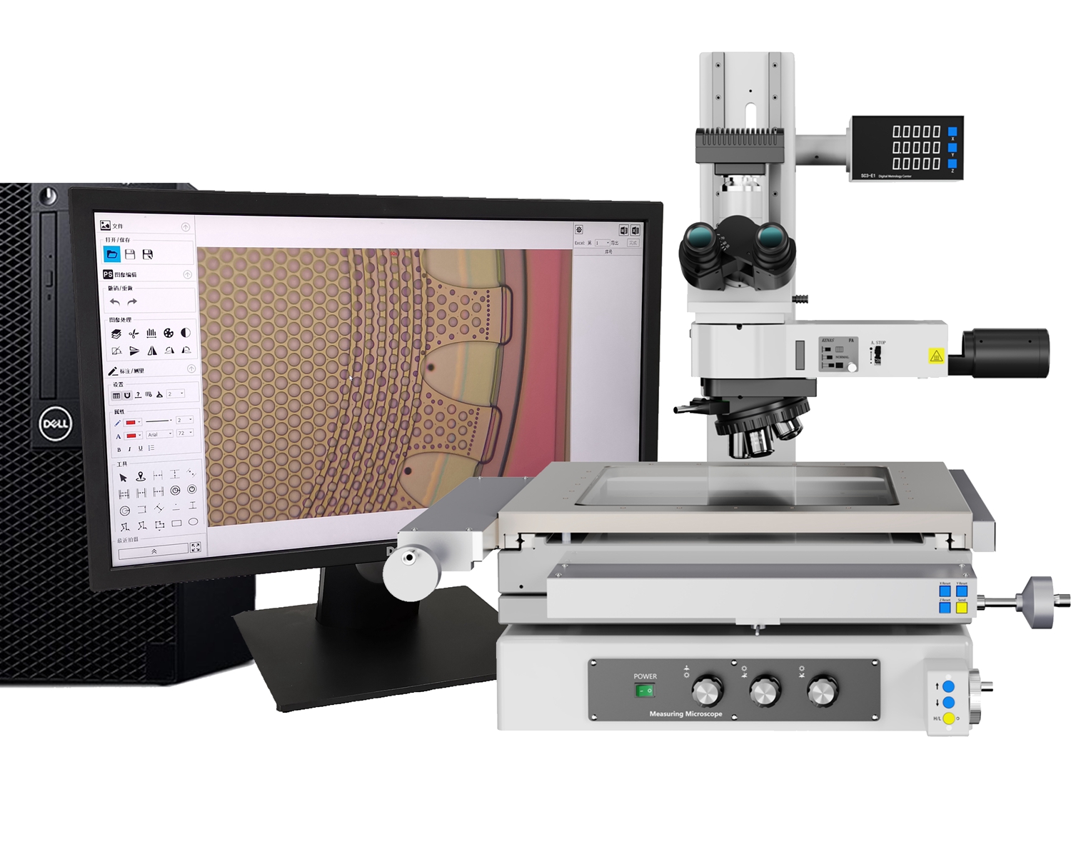 测量显微镜主体 | 手动测量平台(行程 200mm(X)×100(Y)mm,带数显器;样品高度 175mm; 测量精度,X 和 Y :(2+L/200)μm,L 为测量长度(单位 mm) Z:(3+L/200)μm |