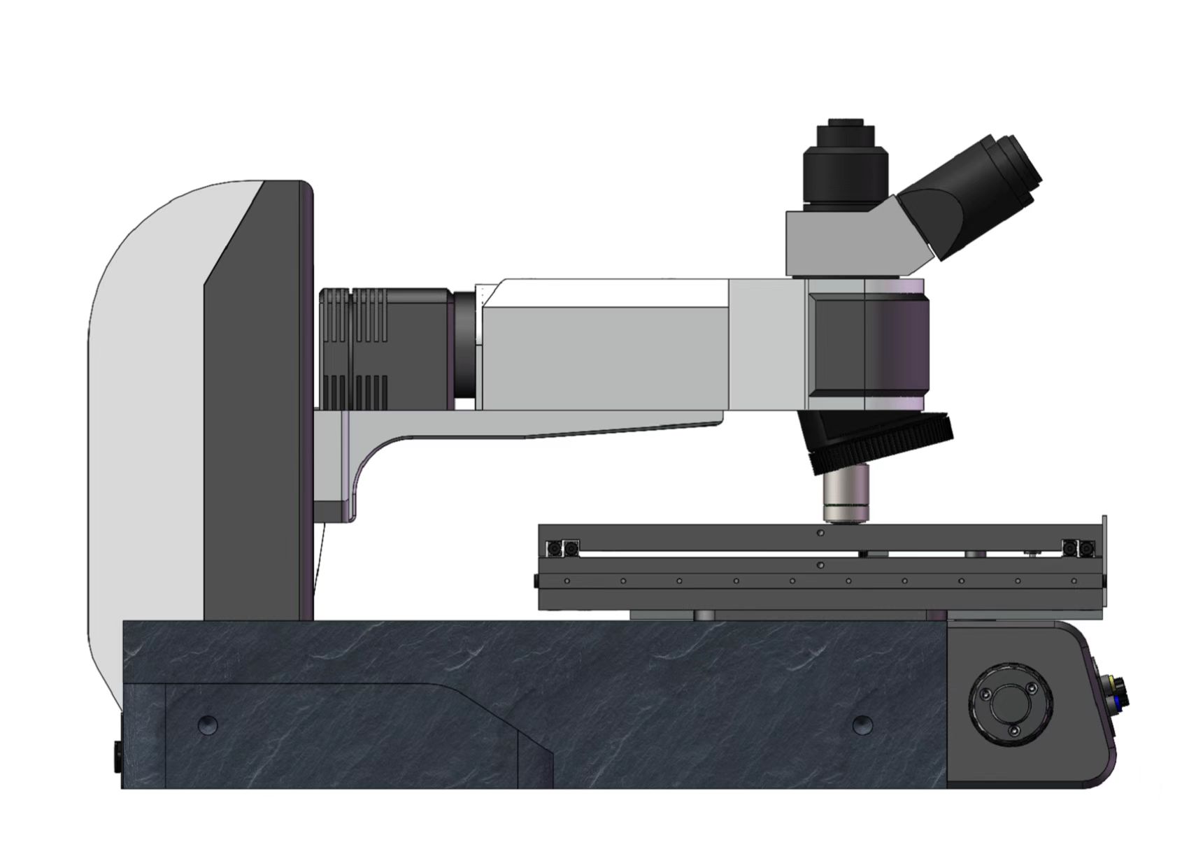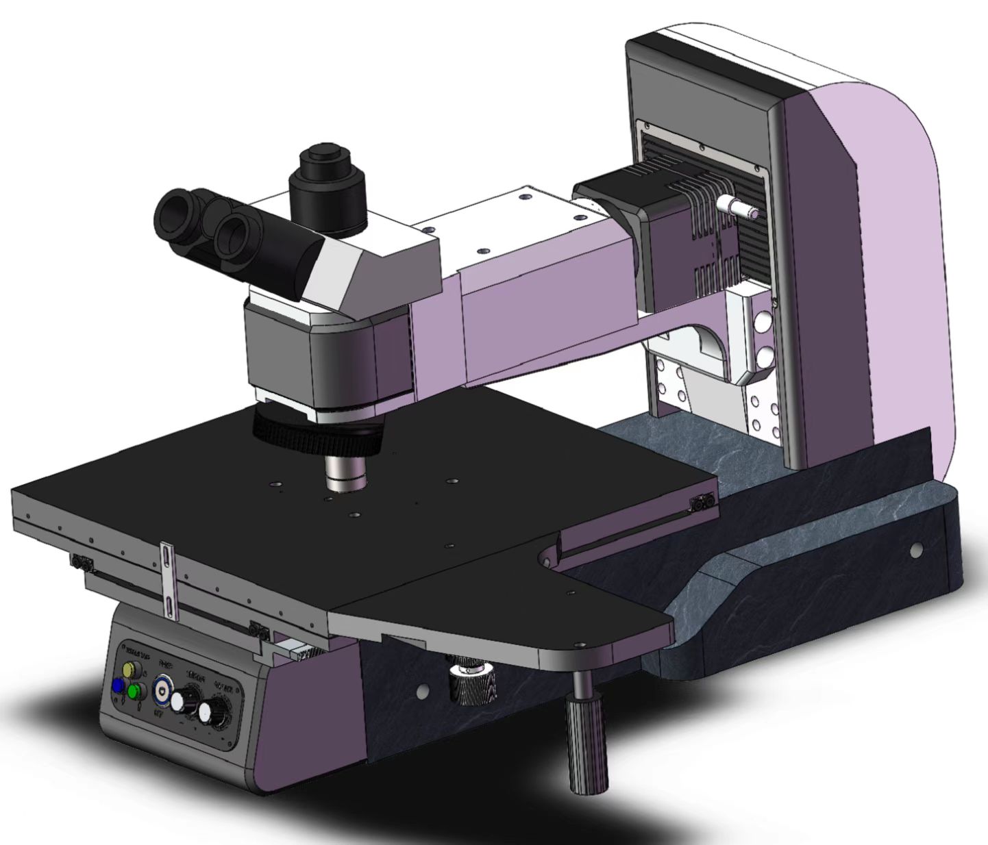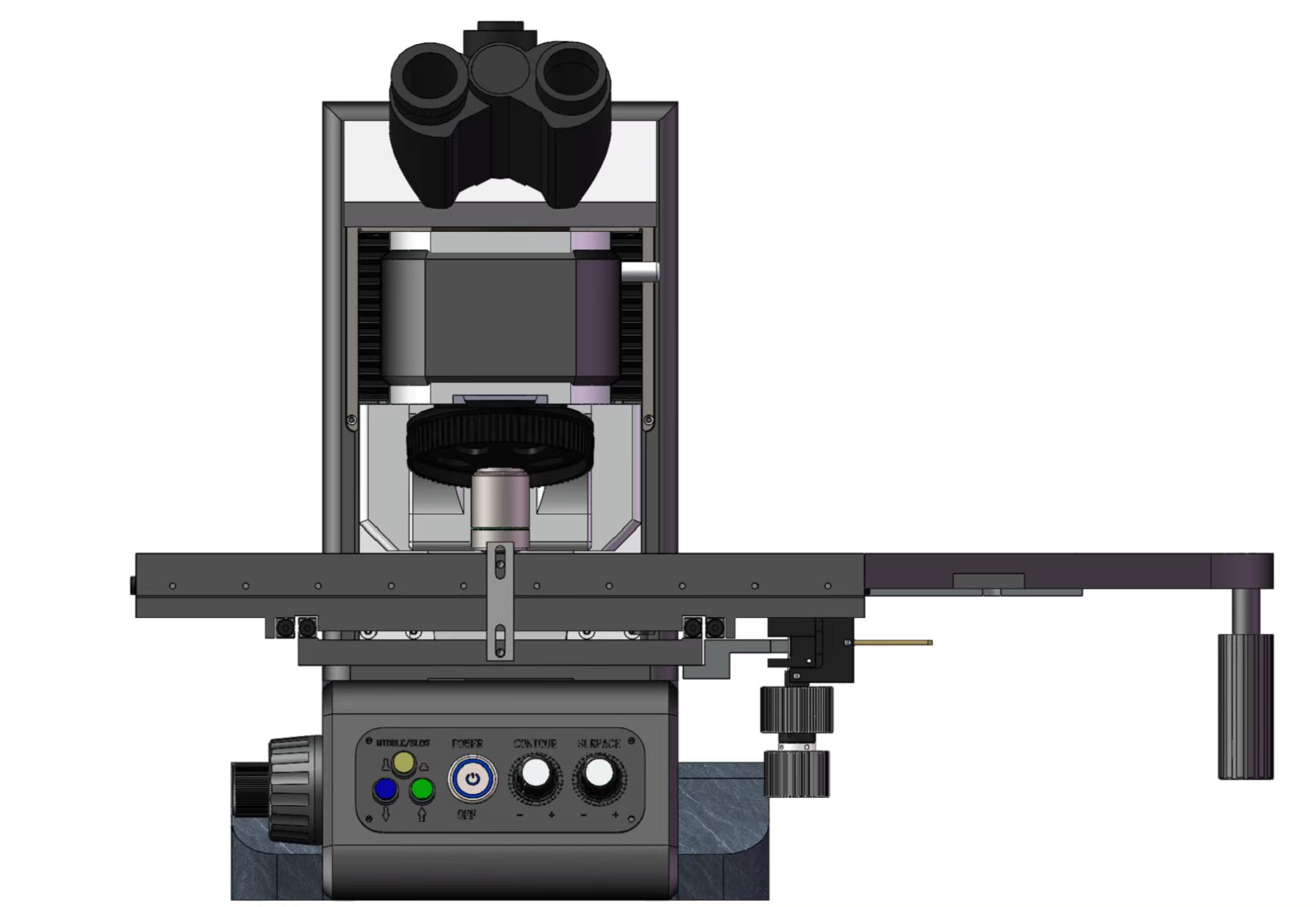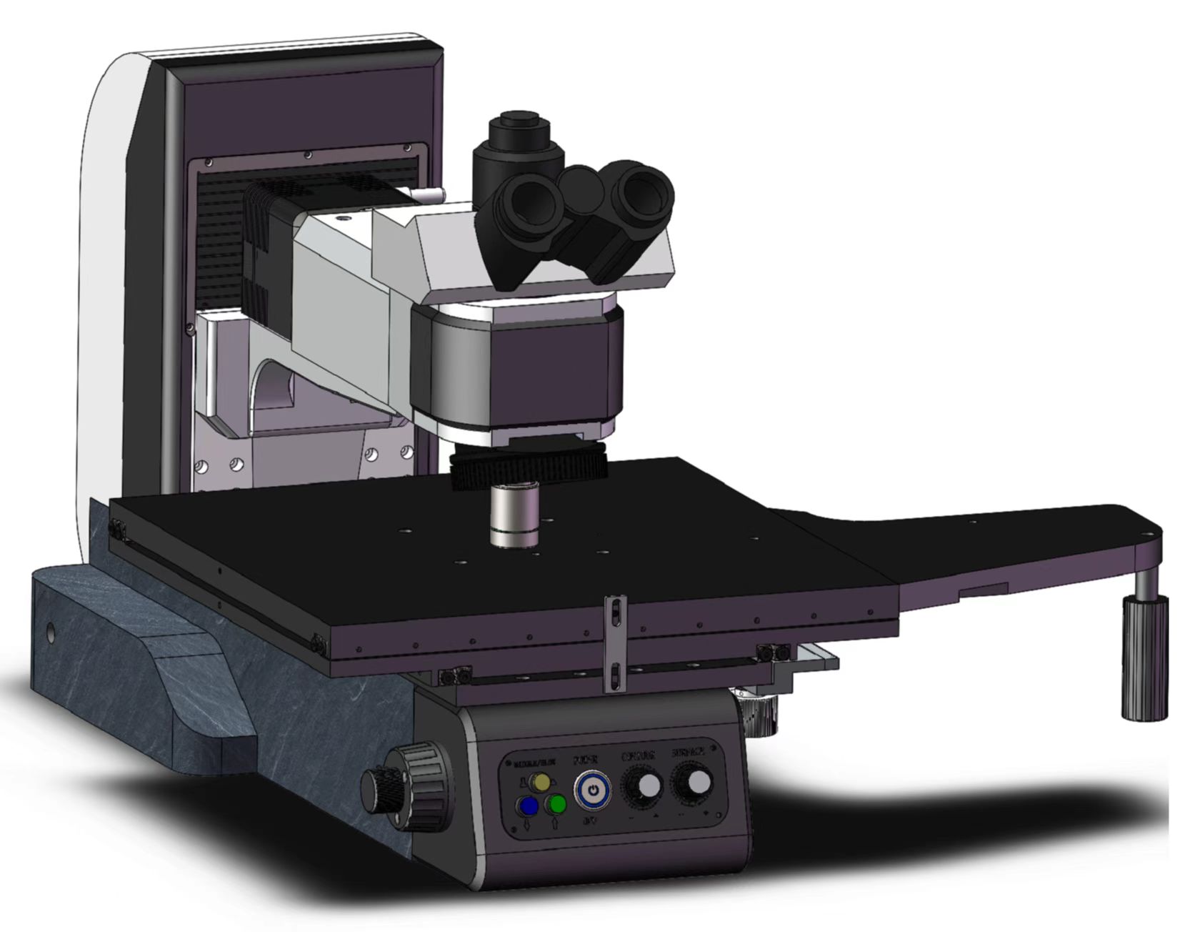 透反射用机架, 低手位粗微同轴调焦机构。粗调行程35mm,微调精度0.001mm。带有防止下滑的调节松紧装置和随机上限位装置。内置100-240V宽电压系统,采用数字调光,具有光强设定与复位功能